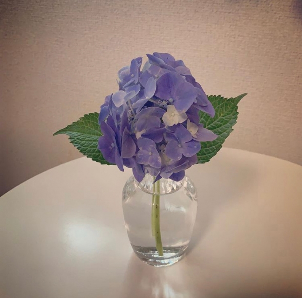 通称 白いお部屋 で 皆様をお待ちしているのは 今年は最後になるのかな? 小さな紫陽花です。 なんとも言えないこの優しい紫色に 心が ポッ と癒されます☺︎